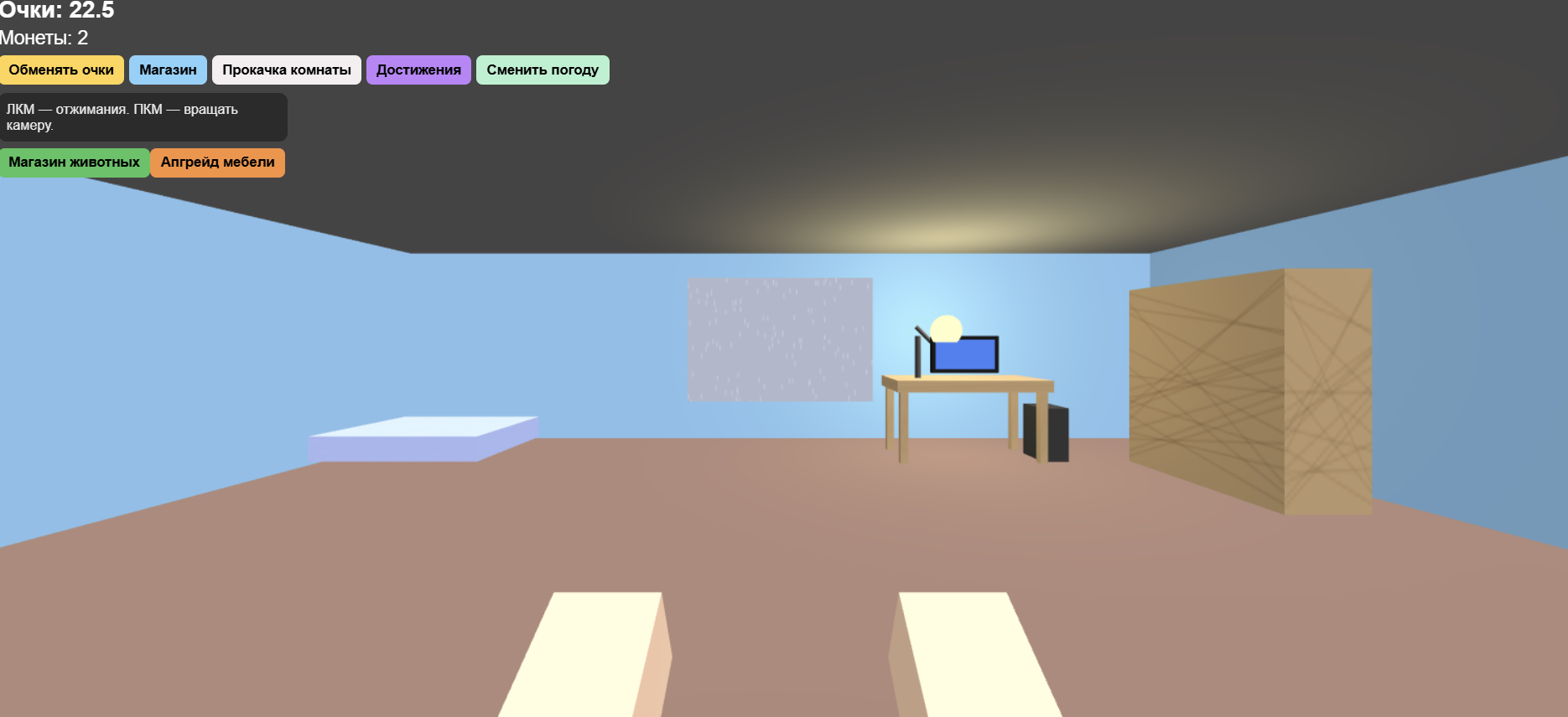 English: Hello everyone, 3D Push-up Game is a push-up game where, surprisingly, you have to do push-ups and earn points that can be exchanged for coins. Coins can be used to purchase upgrades. The game offers several types of upgrades: character upgrades, room upgrades, furniture upgrades, and the ability to purchase pets.You can also change the weather outside at your discretion; there are several options. No coins are deducted for changing the weather.THE GAME IS IN EARLY ACCESS AND WILL BE ACTIVELY UPDATED.